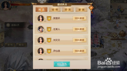 第二步:此时将弹出【+邀请队员】界面,如下图所示,在这里可以邀请四周、结拜、老友和家族玩家。我们可以选择小我组队邀请也可选择组队发布给整个组。