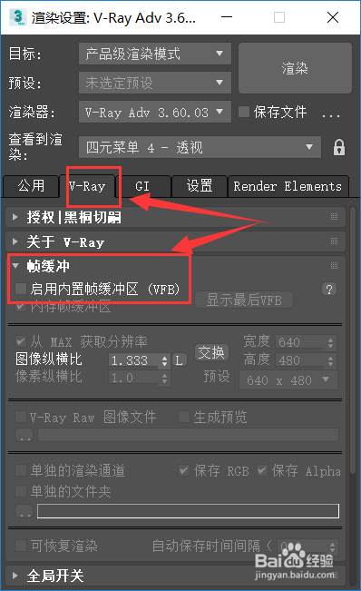 接着我们点击【V-Ray】选项卡,鄙人拉列表中点击【帧缓冲】,将【启用内置帧缓冲区】前的勾去失落,如下图所示。
