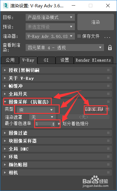 仍是在【V-Ray】选项卡下,点击【图像采样】,将类型更改为【块】,模式为【专家模式】,最小着色率的数值点窜为1,如下图所示。