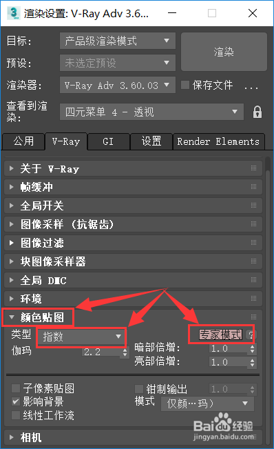 仍是在【V-Ray】选项卡下,点击【颜色贴图】,将类型更改为【指数】,模式为【专家模式】,如下图所示。