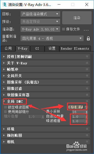 仍是在【V-Ray】选项卡下,点击【全局DMC】,模式点窜【高级模式】,自顺应数目的数值点窜为1,噪波阈值的数目也点窜为1,如下图所示。