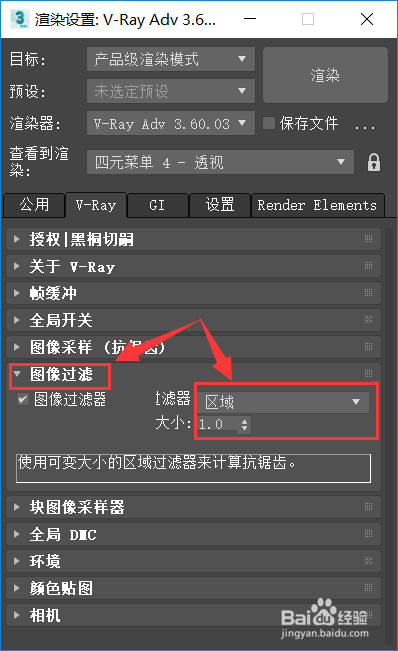 仍是在【V-Ray】选项卡下,点击【图像过滤】,将过滤器更改为【区域】,大小点窜为1,如下图所示。