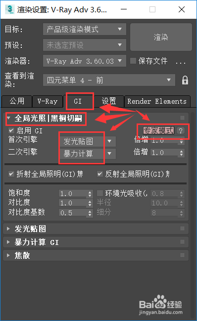 然后点击GI选项卡,点击【全局光照】,模式为【专家模式】,将初次引擎更改为【发光贴图】,二次引擎给改为【暴力计较】,如下图所示。