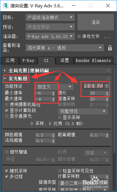 仍是在【GI】选项卡下,点击【发光贴图】,将当前预设更改为【自界说】,最下速度的数值点窜为-6,最年夜速度的数值点窜为-4,模式为专家模式,如下图所示。