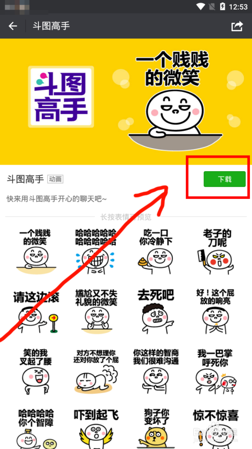 然后点击此中喜好的脸色包,进入该脸色包的详情界面,找到【下载】按钮并点击,起头下载脸色包,如图: