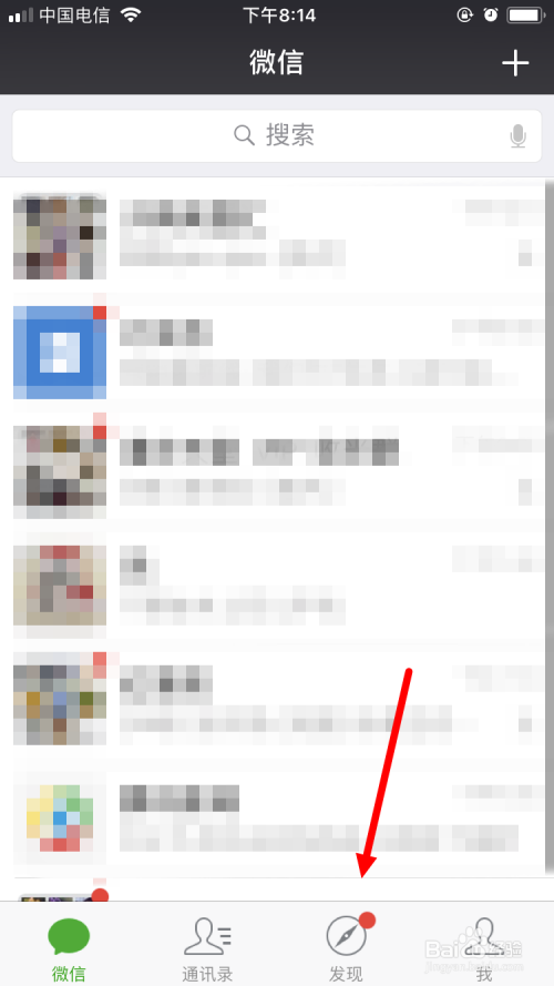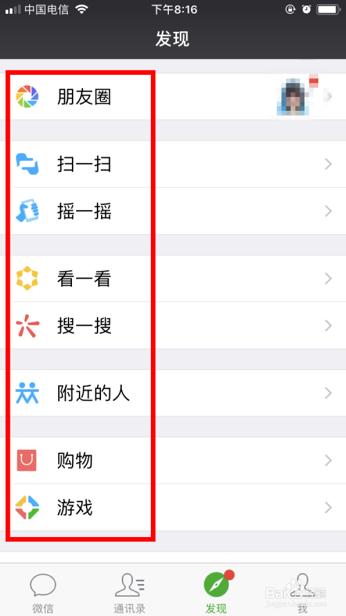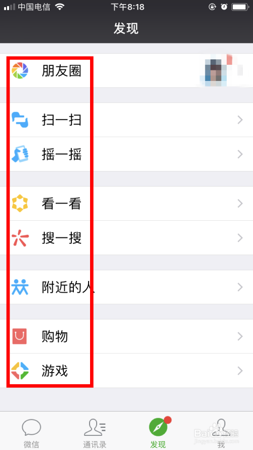 此时可以看到 发现 页面有良多功能。好比 摇一摇 、 扫一扫 、 购物 、 游戏 等等。