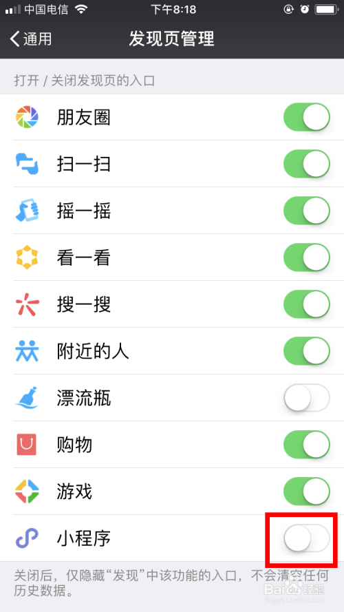 这个时辰,呈现的 发现页办理 页面。可以看到,每一个功能后面都有一个开关。正常环境下,每个功能的开关都是打开的(小编以前封闭过 漂流瓶 )。当我们想要埋没某个功能是,就手动封闭阿谁功能后面开关即可。