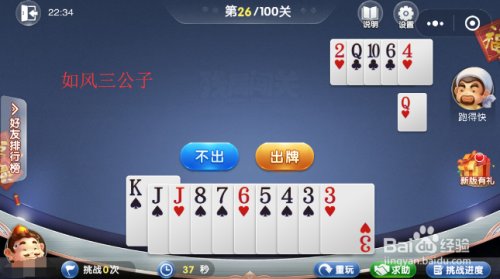 之后对方会出红桃4,我们出J一张,对方会出梅花Q,我们要不起。