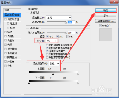 在夹杂选项里面,选择挖空淡色。夹杂颜色带选择灰色,调好响应的参数后,点击确定。