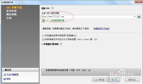 在扫描设置装备摆设标的目的导中,URL和办事器中,输入肇端URL,然后点击“下一步”,如下图所示: