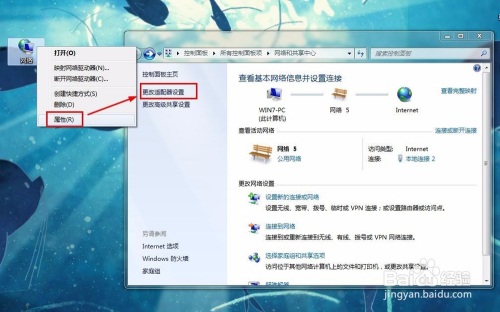 电脑ip又分为内网IP和外网IP,内网就是局域网IP。我们先来看下电脑所分派的内网IP怎么查询。首先,鼠标右键查看电脑桌面上的收集图标属性,然后点击更改适配器设置。