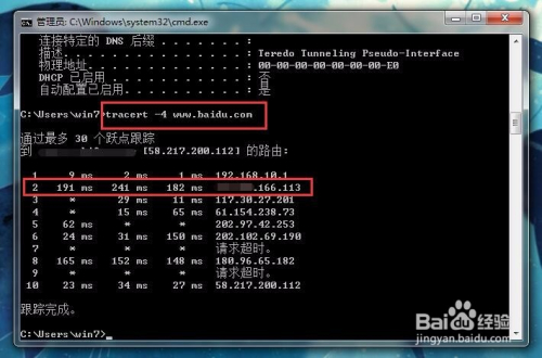 当然了我们还可以用到上面的cmd号令系统的,可以输入号令tracert -4 随便一个网站网址。输入格局如图,按回车执行后就可以看到内网IP了。第二个就是我们的外网IP了,而IP最后的一个数值是会转变的。