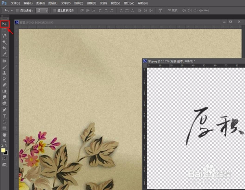 第八步:选中“移动”图标,直接将抠好的字移动到布景图片上。