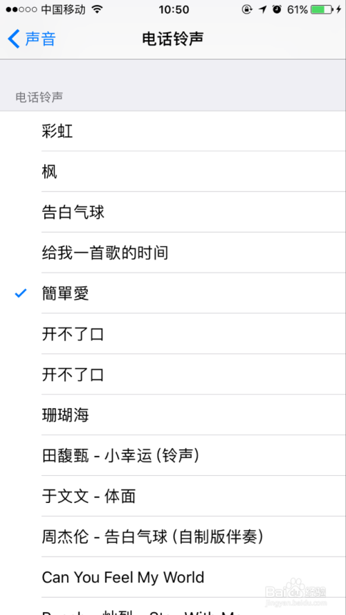 导入当作功后,歌曲会显示在窗口列表中,然后打开手机-设置-声音-德律风铃声,拔取适才导入的歌曲,手机铃声就设置完当作了。