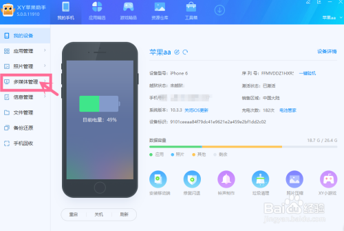 “iTunes”安装当作功后封闭窗口,回到电脑桌面,在打开“XY苹果手机助手”,然后用数据线将手机与电脑进行毗连,毗连时手机上会弹出“是否信赖此电脑”,点击“信赖”,毗连当作功后,XY苹果手机助手窗口内会显示苹果手机详情;