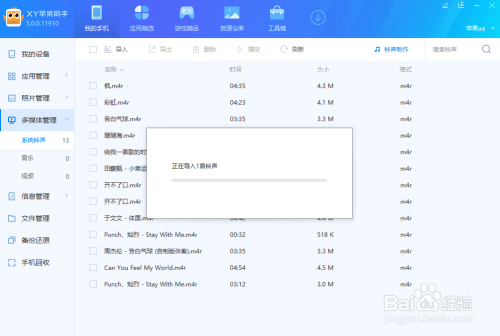 在“XY苹果手机助手”窗口中点击左边“多媒体办理”,鄙人拉列表中选择“系统铃声”,然后点击左上角“导入”,将适才下载在电脑桌面上的歌曲导入手机;