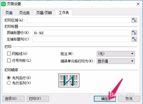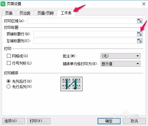 在“页面设置”对话框中选择“工作表”,单击“顶端题目行”右边的按钮
