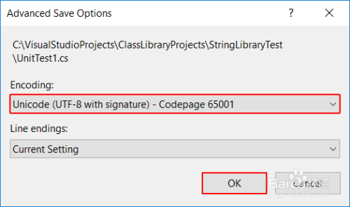 在“高级保留选项”对话框的“编码”下拉列表中,选择“Unicode (UTF-8 带签名) - 代码页 65001”,然后选择“确定”,如下图所示:
