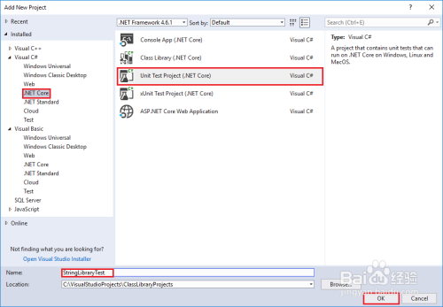 然后,依次选择“.NET Core”节点和“单位测试项目(.NET Core)”项目模板。