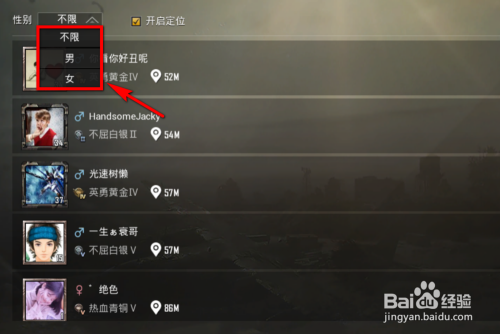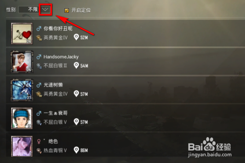 若是想对四周的人的性别进行筛选的话,就点击页面左上角图示位置的下拉箭头。
