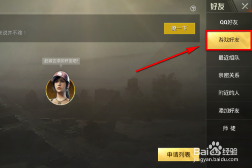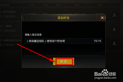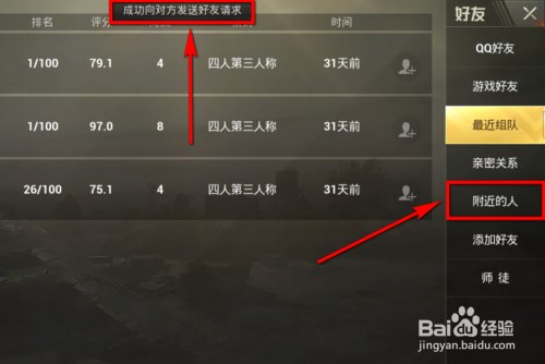 点击发送后,在组队老友页面上方就会弹出一个【当作功标的目的对方发送老友请求】的提醒信息。除了经由过程添加组队老友的方式以外,还可以加四周的人。