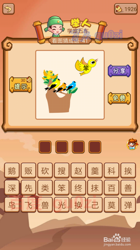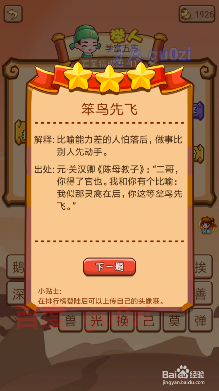 会试41关,图中是一窝的小鸟,不外有一只写着笨的小鸟在飞,这定是要申明 笨鸟先飞了。