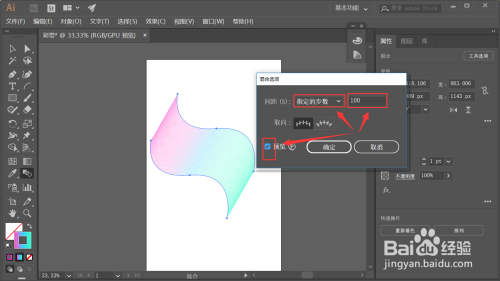 在弹出的夹杂选项从对话框中将间距一栏设置当作指定的步数,数值设置为100,我们可以点击左下角的预览,按照预览调节数字大小,如下图所示。