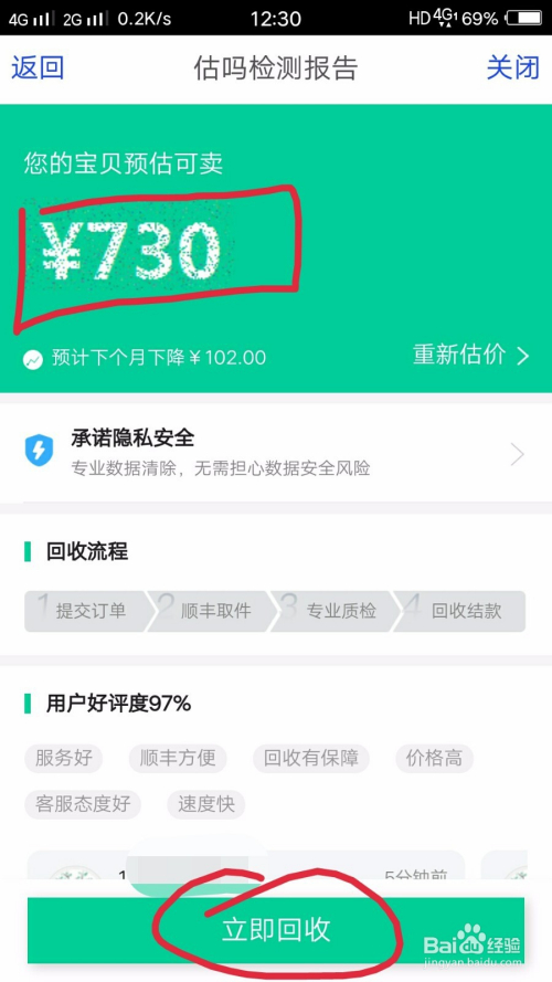 手机可卖的价钱会显示在顶部,当然这个只是一个评估的价钱,具体落实还需要最终的验货后才可以。