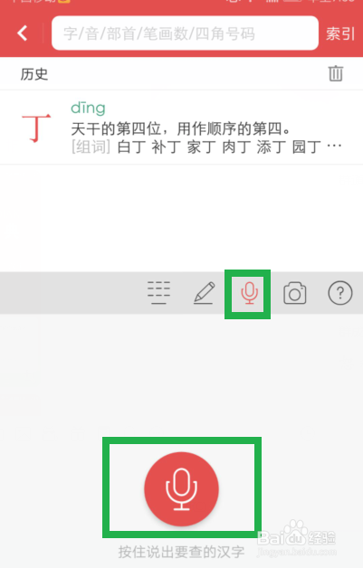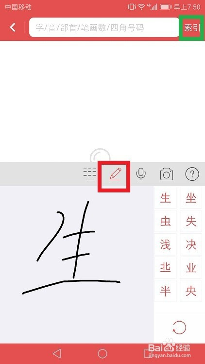 若您不知其音,还能点红杆的笔状,将它写入左侧灰幕,格中就会浮出,再点即得知字音了。