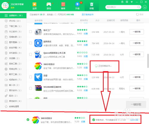 打开软件管家后——选择上方的分类中的:卸载——找到360手机助手并勾选——点击一键卸载。(若是不勾选,可以直接点击该行的一键卸载。)