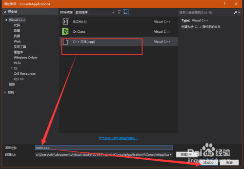 7. 在添加新项面板中选择c++文件(.cpp)->设置名称->添加。
