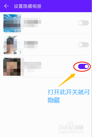 ②点击此项就可弹出"埋没相册"功能了,如下图;然后系统会将我们手机里面的照片分类显示,有锁屏图片、系统相册以及我们本身拍的照片等,将其埋没开关打开即可埋没了...