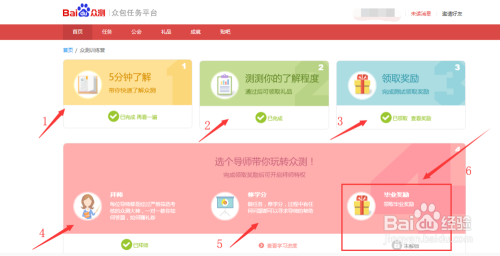 方才插手百度众测这个平台,你需要完当作系统的新手指引使命,如下图所示。前三步根基没有问题,我们从第四步导师选择起头,就要起头进入 百度众测 的本家儿题了。只有选择好导师,完当作新手使命,才能尽快地当作为一个给力的 百度众测 的正式当作员~