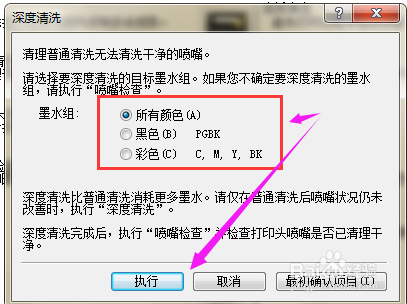 7、点击之后会弹出一个界面,在这个界面中可以选择各个颜色的喷头被清洗,之后点击界面下方的执行选项就可以了。