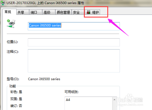 5、进入到打印机属性界面后,在界面中有个维护的选项,点击它。