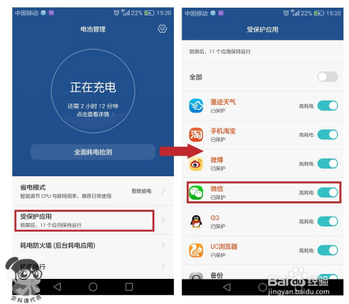 点击【设置】>【高级设置】>【电池办理】>【受庇护应用】,将微信勾选当作【已庇护】。