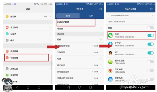 点击【设置】>【权限办理】>【主动启动办理】,将微信勾选为【许可开机主动启动】。