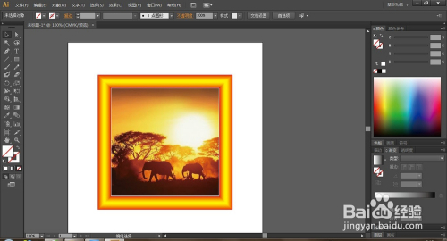 执行文件-置入,将布景置入进来,调整其大小,选择矩形东西绘制相框内径大小的矩形,选择图片,执行对象-剪切蒙版-成立,快捷键Ctrl+7,建立剪切蒙版。最终结果如图: