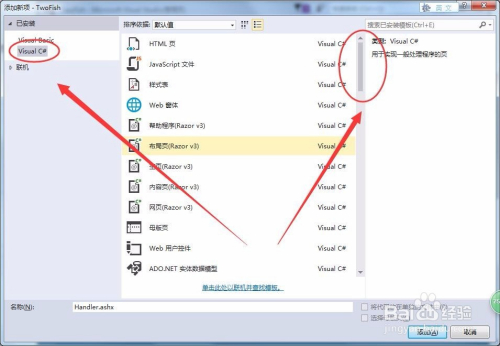 添加新项窗口中,左侧选择Visual C#,标的目的下拖动右侧的滚动条。