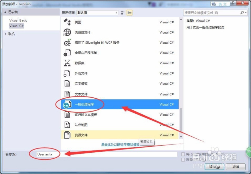 列表中选择一般处置法式选项,将名称改为User.ashx,单击添加。