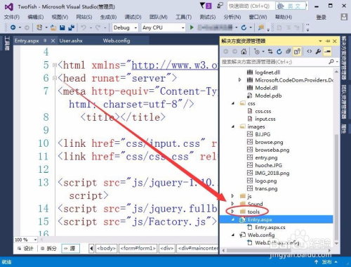 在Visual Studio窗口中,选择文件---->打开---->网站,打开一个已有的网站,本例为TwoFish。