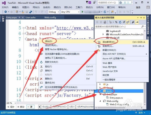 呈现的快捷菜单中,选择添加---->添加新项,如下图所示。