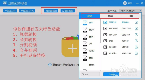 - 别离是:视频格局转换、音频格局转换、手机设备转换、视频朋分处置、视频归并处置