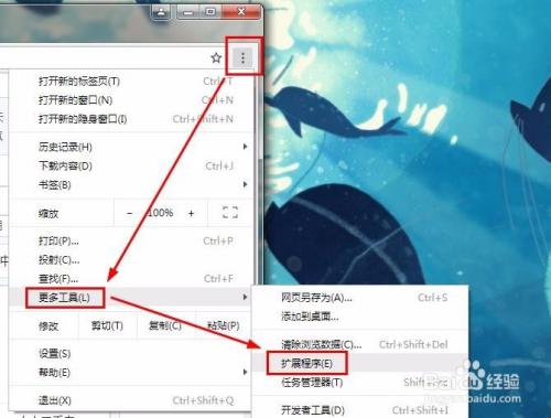 接下来我们打开我们的google浏览器,点击浏览器右侧的自界说按钮,然后选择更多东西下的扩展法式。