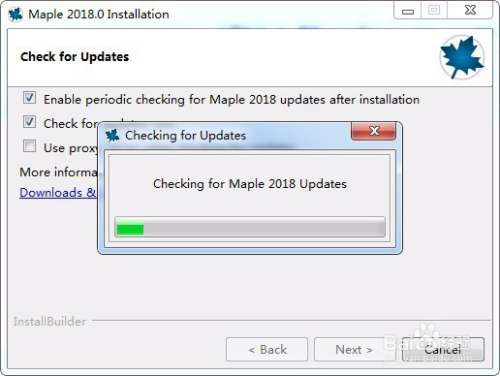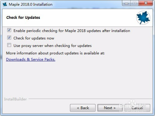 (1)Enable periodic checking for maple 2016 updates after installation:启用按期查抄安装后的maple2016更新(2)check for updates now:此刻查抄更新(3)use proxy server when checking for updates:在查抄更新时利用代办署理办事器默认勾选第1和第2,同样也建议直接默认并点击“Next”,如下图所示: