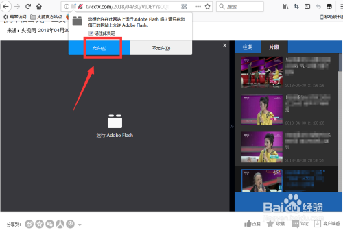 火狐浏览器弹出运行Adobe Flash的提醒框,点击【许可】按钮,火狐浏览器就可以不雅看视频了,如图:
