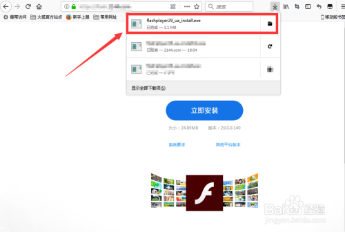 可以查看到火狐浏览器已经下载完当作的所有文件,然后点击方才下载的flash插件,如图: