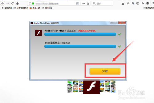 火狐浏览器起头安装Adobe Flash Player法式,安装完当作后点击【完当作】按钮,如图: