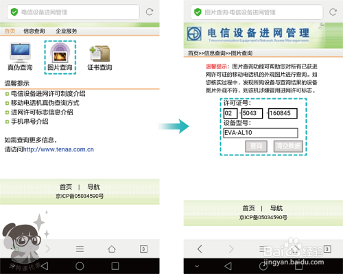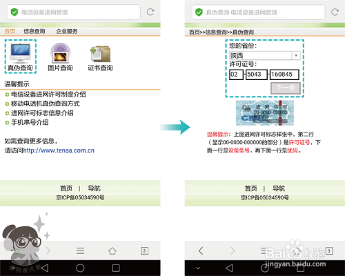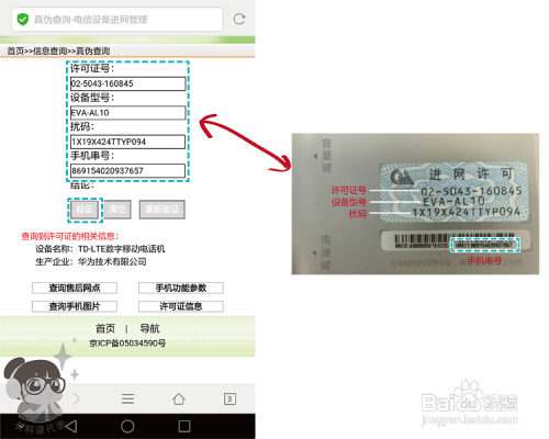 点击【真伪查询】,选择省份,输入许可证号、扰码、手机串号(IMEI)。许可证号、设备型号、扰码、手机串号(IMEI)均可在手机背壳上的电池盖庇护膜(背贴)上看到。