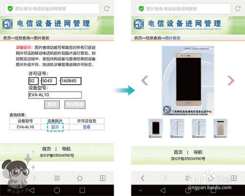 在查询成果页面,点击【显示】查看手机在申请打点进网许可证时提交外不雅照片,或者点击【查看】查看进网许可证信息。